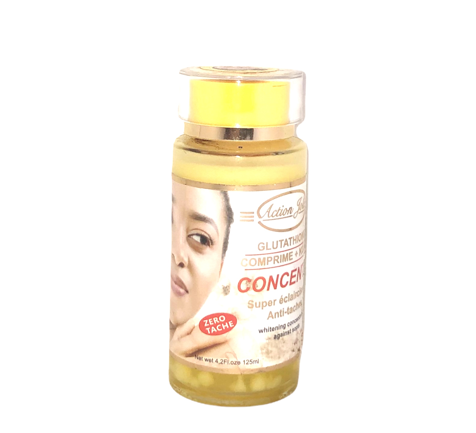 Concentré  glutathion  blanchit naturellement à l’action  prouvée pour un teint nettoyé sans tâches qui corrige les imperfections et élimine boutons, les cernes,   prévient leur réapparition,  supprime les points blancs,  la peau est lisser en un seul geste, sans tâches ni rides et anti-quintaux 30 ML/100 ML Concentré.