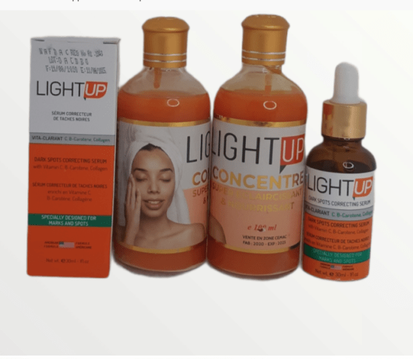 Deux Concentrés éclaircissant Light Up correcteur de taches brunes avec vitamine C&B, carotène et collagène 30 ml. Light up serum est un complexe Vita-Clariant enrichi en Vitamine C, B-Carotène, Collagène, un concentré d’aloe Vera et de fruits essentiels. -Élimine les taches brunes -Tons -Élimine les jointures foncées, les genoux foncés et les coudes/pieds foncés -Hydrate et adoucit la peau Il cible les zones impures de votre peau pour unifier le teint.contenance 100ML