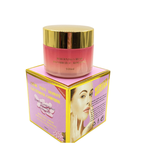 La crème éclaircissant Teint Diamant au gluathione comprimé est un produit de pointe aux propriétés éclaircissantes essentielles, formulé par des experts pour fournir en toute sécurité des résultats optimaux. La crème éclaircissante Teint Diamant éclaircit en douceur lorsque le teint est inégal ou décoloré. Elle agit sur les taches de rousseurs, les taches de vieillesse et les taches d’hyperpigmentation. Elle nourrit la peau, améliore sa texture globale et lui redonne sa vitalité juvénile.