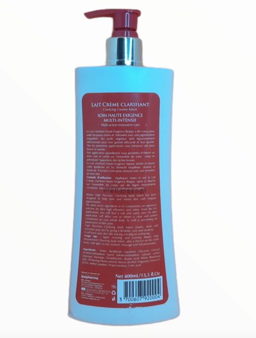 Gamme clarifiant haute exigence Biopur a été conçu pour aider les peaux noires et métissées avec une pigmentation irrégulière. Ses actifs végétaux sont rigoureusement sélectionnés pour leur grande efficacité et leur qualité. Dès les premières applications vous retrouverez une peau douce et satinée pour leur grande efficacité et leur qualité. Dès les premières applications vous retrouverez une peau douce et satinée. Son application quotidienne vous permettra d’obtenir un teint clair et unifié sur l’ensemble de votre corps en prévenant l’apparition des taches brunes. Le lait clarifiant haute exigence répare,tonifie et nourrit votre épiderme en lui donnant souplesse, aisance et élasticité. Il laissera votre peau soyeuse avec sensation de bien-être. Lait 400 ML