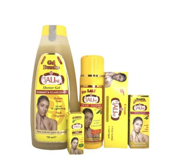 Peau Jaune a été conçu pour les personnes qui veulent un teint plus radieux et plus clair, il éclaircit rapidement la peau en éliminant les tâches brunes ou rebelles, les marques de grossesses.Lisse la peau supprime les rides et cernes.La contient 5 produits.