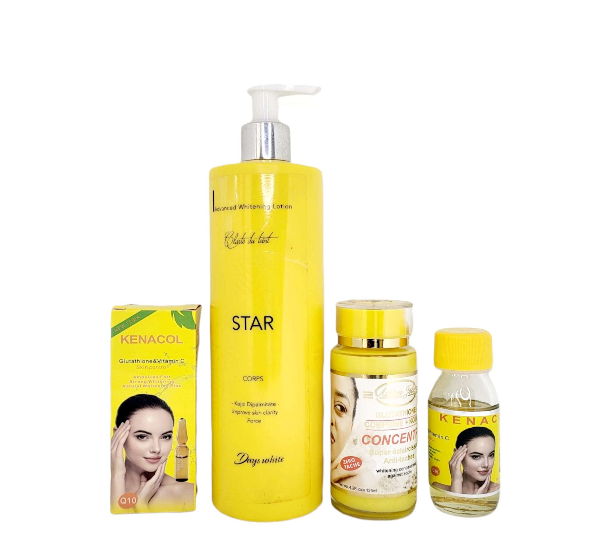 Aqua (water), Glycerin, Acetyl Alcohol, kojic,allantoin, Coconut oil,glutathion,kenacol Kojic Dipalmitate.