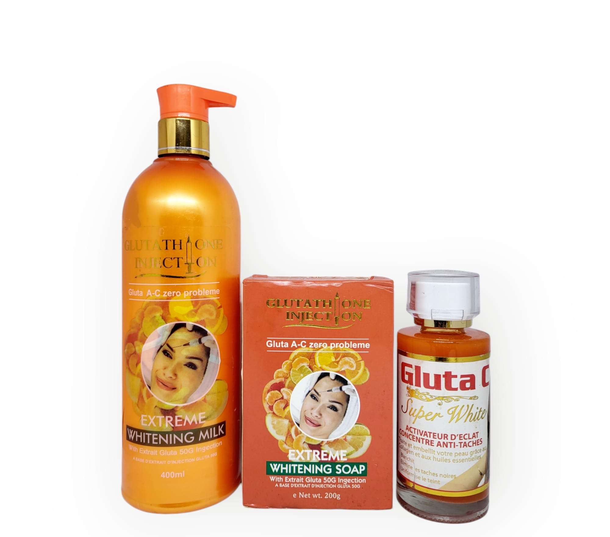 Trio teint métisse corps et visage gluta-AC white formule a base de comprimés  Glutathione comprimé procure 50 gr injection kojic 50 grame kojic,huiles d’argan, acides de fruits, vitamines A  E une hydratation à la peau. Ses principaux ingrédients qui rendront votre peau éclatante. Elle contient du Glutathione en comprimé qui possède des propriétés éclaircissant facilite aussi le nettoyage des impuretés contenues dans les cellules de la peau. Le lait Glutathione comprimé extra blanchissant et aux huiles essentielles laissera votre peau plus claire, plus jeune, plus douce au touché et parfaitement hydratée pour une peau plus fraîche. La vitamine A E assure l’équilibre d’hydratation naturel de la peau.  rend votre épiderme plus lisse, plus jeune, plus claire et plus doux. 400ml