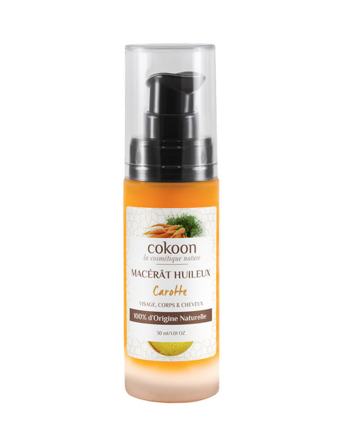 L’huile végétale de carotte de Cokoon est huile végétale riche en antioxydants le macérât huileux de carotte maintient l’élasticité de la peau et apporte un effet bonne mine.