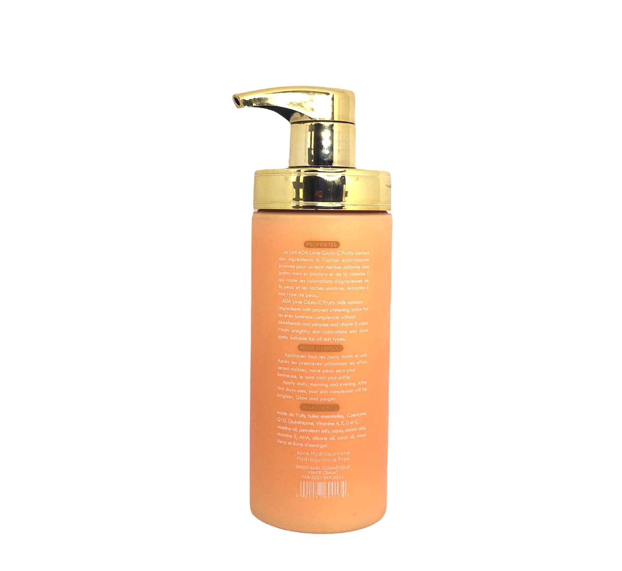 Lait corporelle ada love gluta-c fruity contient des ingrédients blanchissants et hydratants efficaces pour un teint metisse uniforme supprime des taches et points noires , traite la décoloration disgracieuses de la peau et tâtches sombres .avec des ingrédients puisante anti-âge, tels que le coenzyme Q10, glutathione,huile essentielles, vitamines. A ,E,D,et C, vaseline huile, AHA, l’huile de carotte, aloe vera,bave d’escargot. Il nourrit et gomme en douceur la peau. Il aide à améliorer la sécheresse, la rugosité et l’obscurité de la peau, laissant la peau hydratée, blanchissante et lisse, créant élasticité et sensibilité. Peau glissante, parfum romantique frais et féminin , rajeunissant et rayonnant.