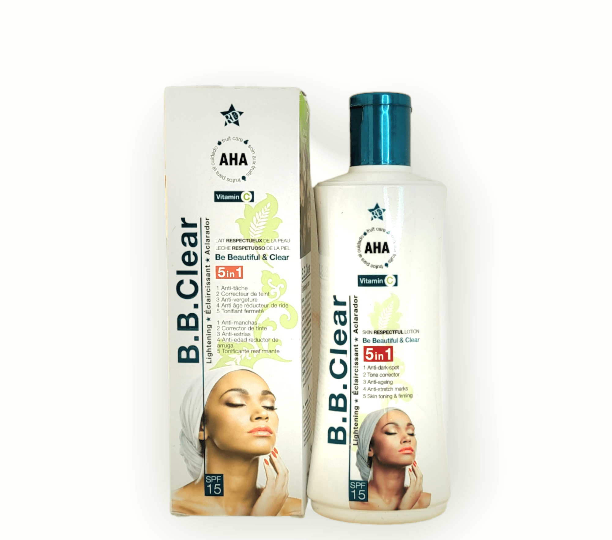 Le lait corporel éclaircissant 5 en 1 AHA BB CLEAR améliore l’apparence de la peau et aide à réparer les tâches sombres des dommages causés par le soleil.Sa formule unique et spécifique, enrichie en extrait de carotte antioxydant, elle élimine efficacement toutes les taches les taches hyper pigmentation, tout en assurant douceur et souplesse à votre peau.