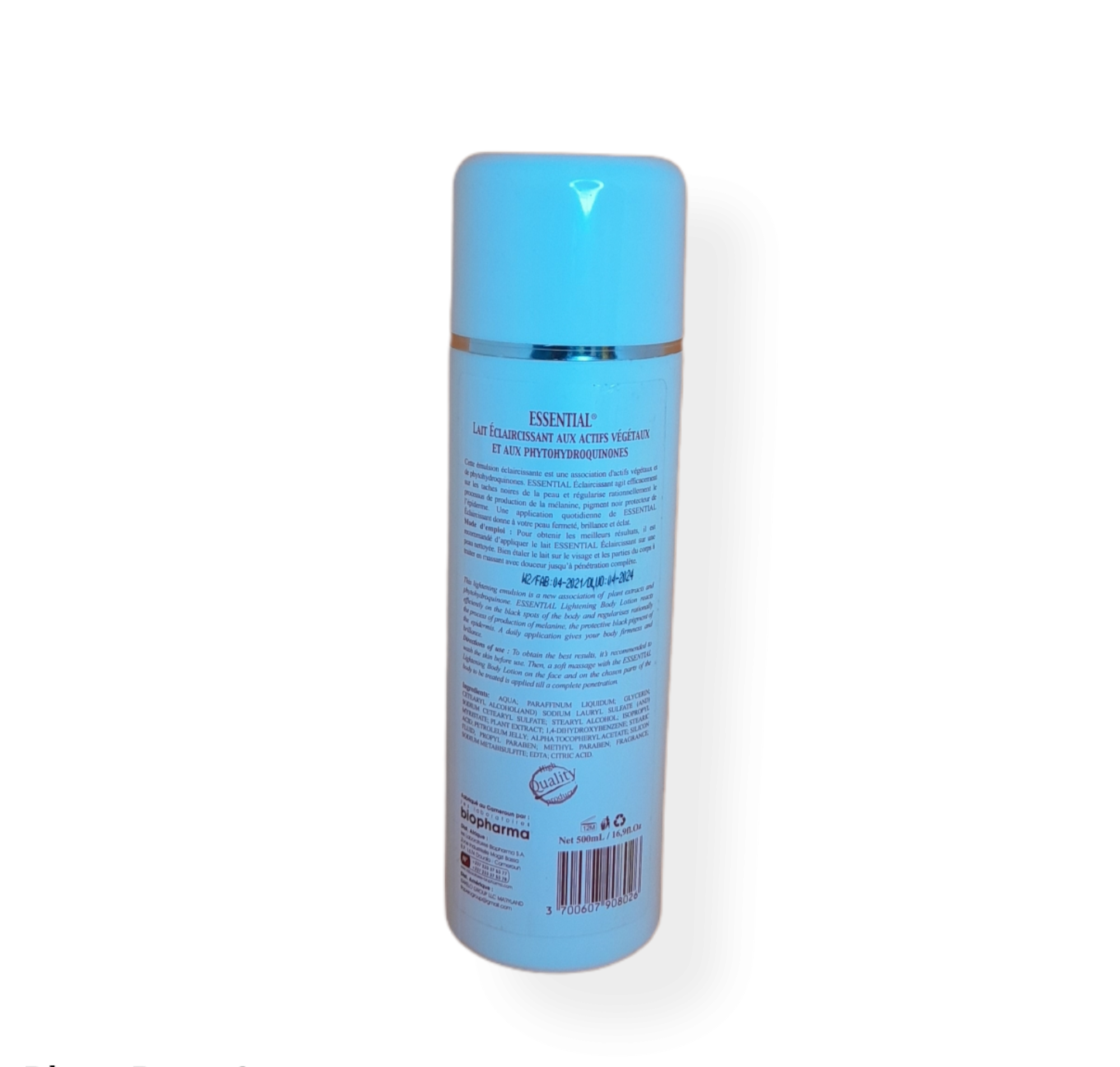 Le lait éclaircissant Essential est un lait éclaircissant aux actifs végétaux et aux phytohydroquinones. Le lait est anti taches, toutes vos imperfections auront disparus et votre peau sera brillant et propre.