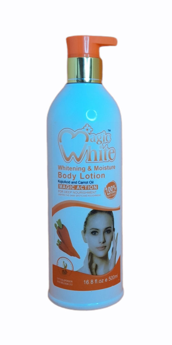 Magic White découvrez une peau parfaite Formule brevetée avec de l’huile de carotte ! Magic White Whitening & Moisture Lotion sont des formules enrichies qui diminuent les tâches sombres et les décolorations de la peau causées par le vieillissement de l’acné, les dégâts causés par le soleil et la grossesse. Cette formule spéciale est enrichie avec de l’huile de carotte et de la vitamine A et E pour aider à restaurer et maintenir l’équilibre hydrique essentiels de la peau laissant votre peau très douce.