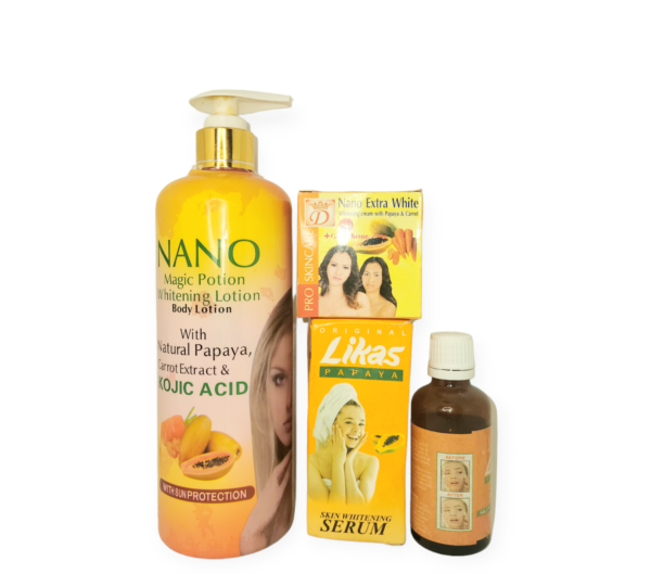 Nano lait pour le corps enrichi en agents blanchissants, sérum,créme visage cliniquement prouvé pour éclaircir les taches brunes et illuminer le teint. Enrichi en nutriments hydratants pour renforcer la barrière protectrice de la peau contre la perte d’humidité. Texture à absorption rapide et non collante, pour une peau douce, souple et intensément hydratée tout au long de la journée. Il contient un écran solaire pour consolider l’effet blanchissant.500ml