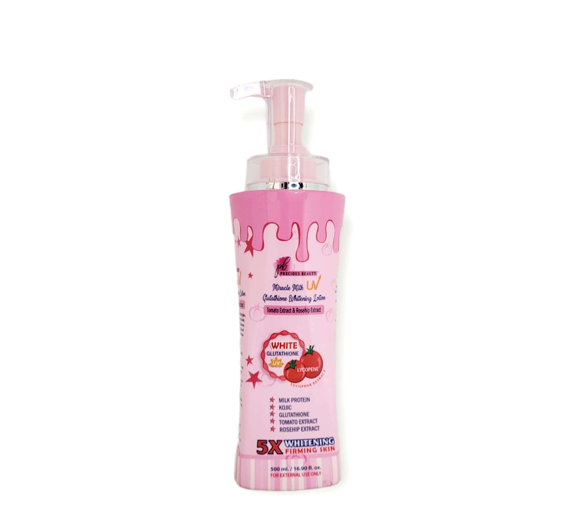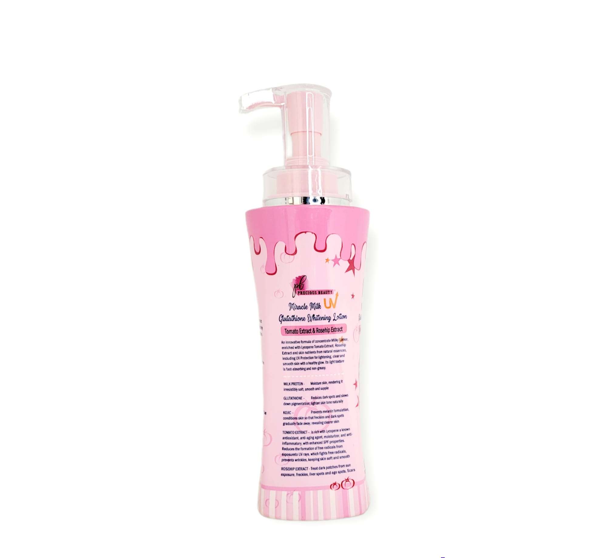Appliquer le lait Precious Beauty Miracle Milk UV glutathion sur tout le corps sur une peau préablement nettoyé.