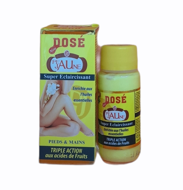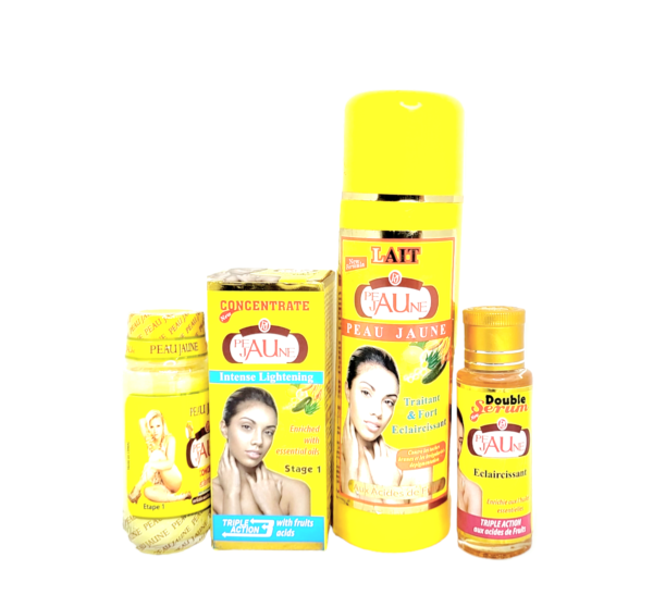 Peau Jaune a été conçu pour les personnes qui veulent un teint plus radieux et plus clair, il éclaircit rapidement la peau en éliminant les tâches brunes ou rebelles, les marques de grossesses.Lisse la peau supprime les rides et cernes.La contient 3 produits. Élimine les cellules hyper-pigmentées tout en hydratant intensivement votre peau, ces actif éclaircissant agissent au de l’épiderme et permet d » obtenir un très clair sans tâches.
