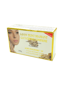 Le savon Teint Diamant Glutathion Comprimé est un savon éclaircissant efficace avec acide hyaluronique, Glutathion, vitamine C, de Collagen, des huiles essentielles, protecteur UV qui hydrate votre peau en profondeur, rendre votre peau éclatante et contient du glutathion en comprimé qui possède des propriétés super éclaircissantes.