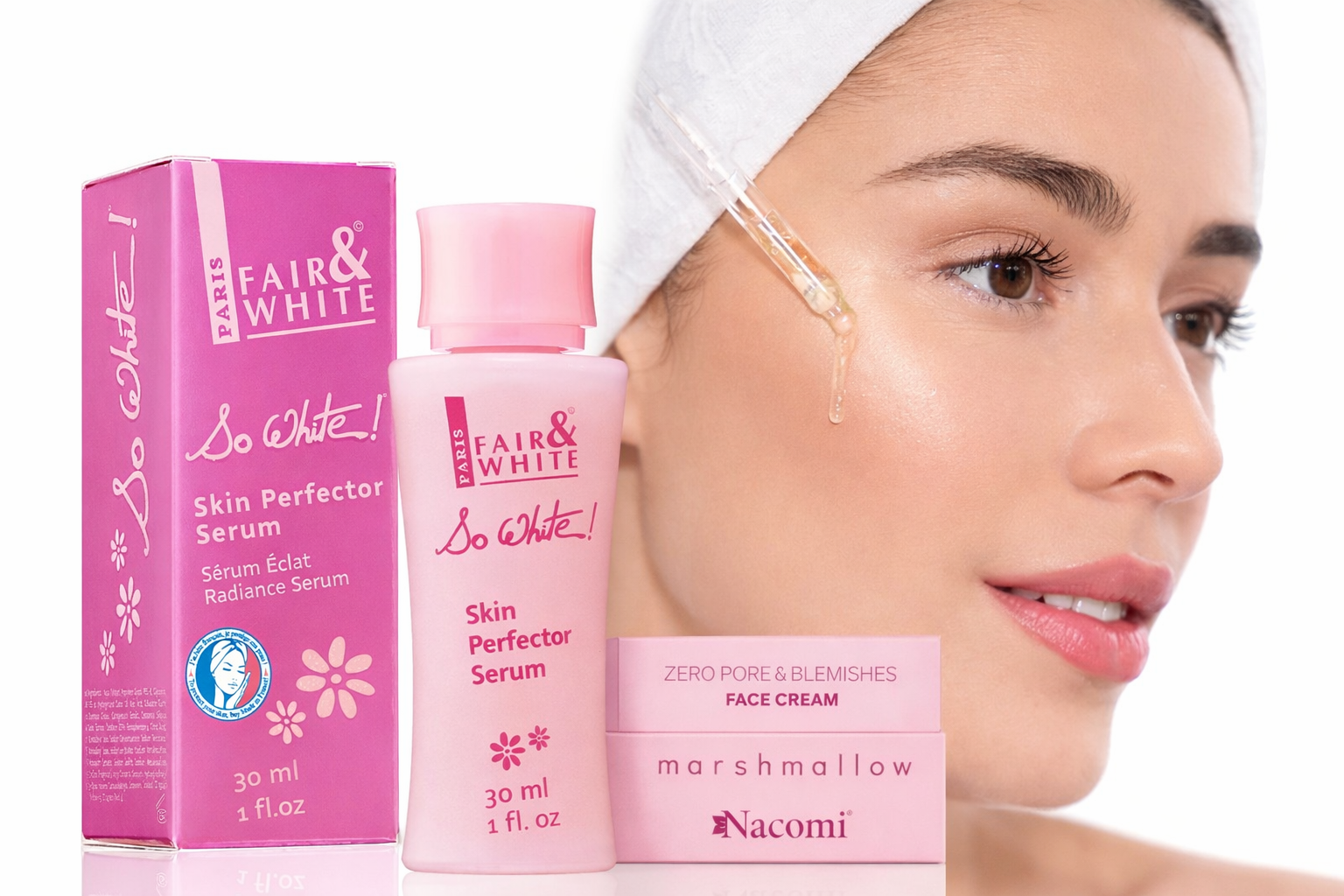 sérum éclat visage, fair and white so white, skin perfector serum, crème nacomi marshmallow, routine peau lumineuse, anti imperfections visage, resserrer pores, soin visage hydratant