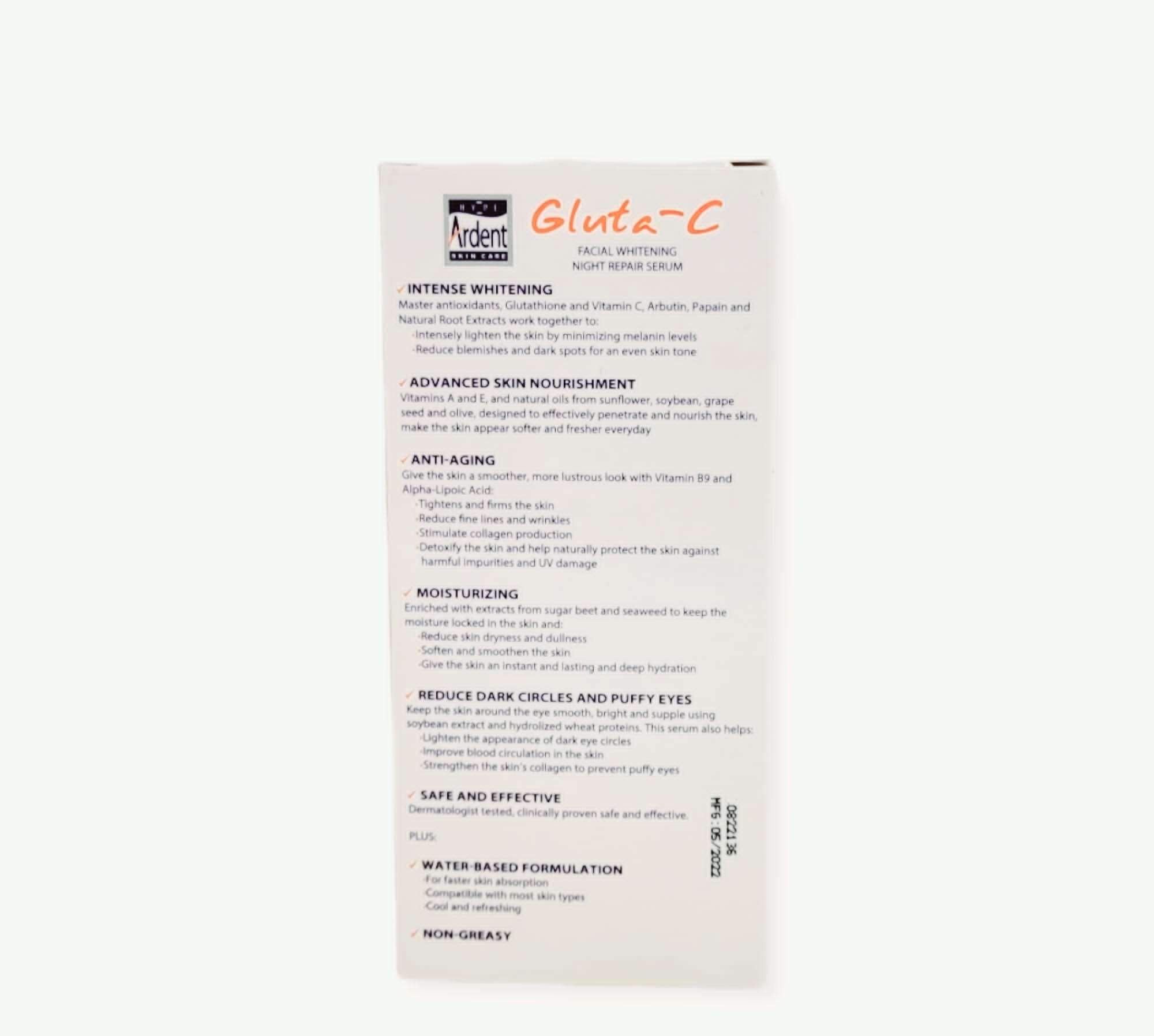 L’éclaircissement de la peau Gluta-C sérum tube intense et concentré nuit réparateur consiste en une puissante combinaison de glutathion, de vitamine C,arbutin,anti-oxidant. Ceux-ci vous offrent une peau propre combinée à l’effet éclaircissant de la peau. Le sérum de visage stimule le collagéne, réduit les rides, un effet mat, ce qui assure un aspect doux.