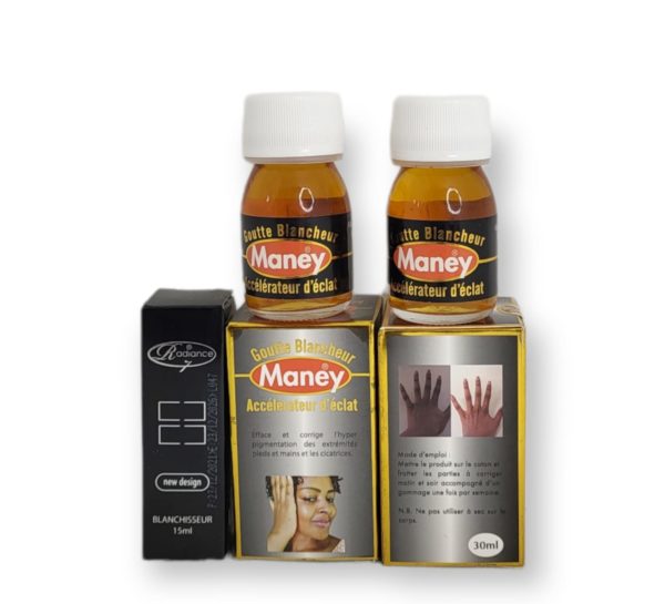 2 maney anti-tâches et un blanchisseur super éclaircissant qui participe rapidement et efficacement dans l’éradication complète des tâches noires, des doigts, pieds,orteils,genoux,coudes et toutes les autres imperfections de la peau ,rend le teint propre et clair.