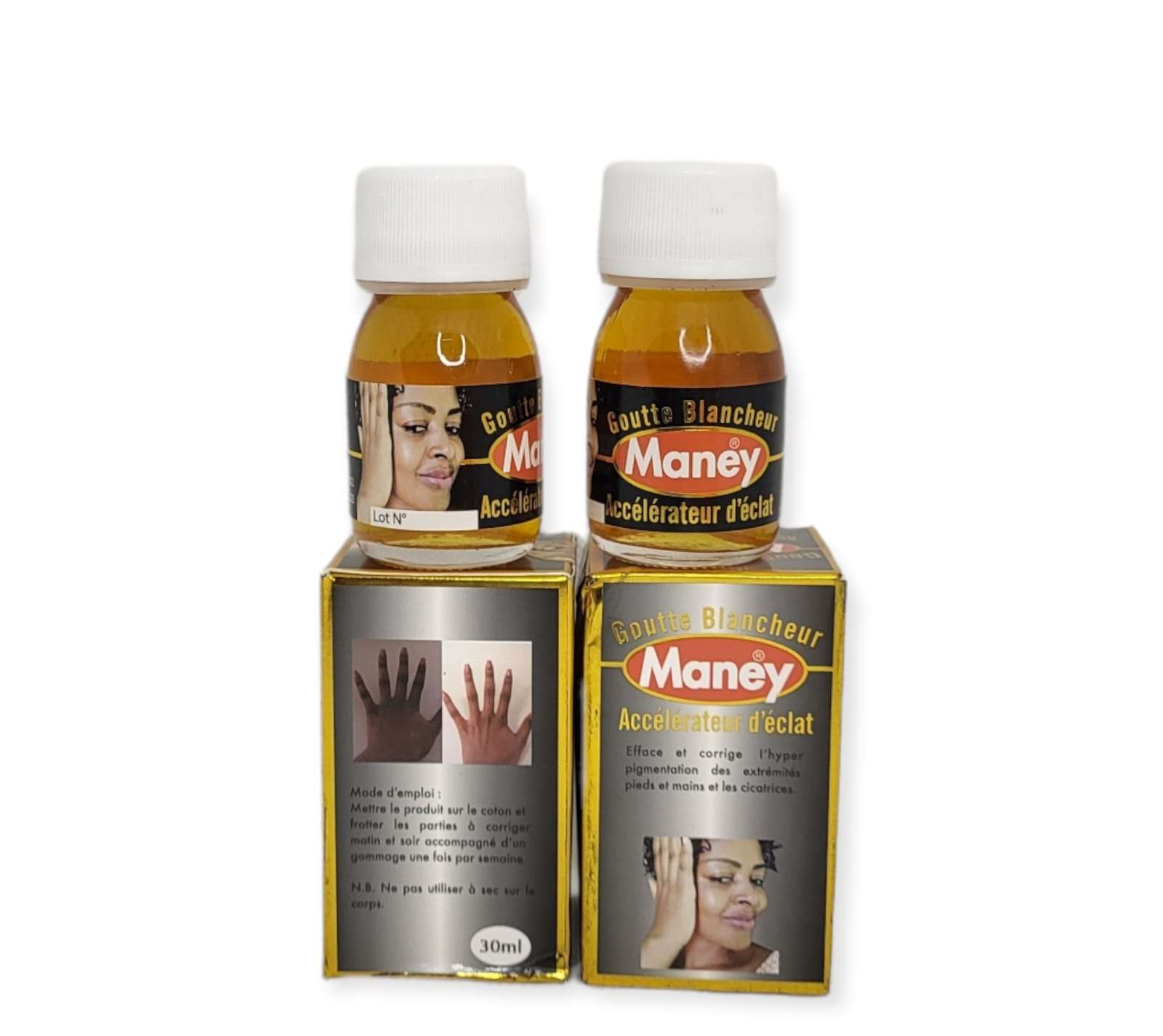 La goutte blancheur Maney accélérateur d’éclat efface et corrige l’hyper pigmentation des extrémités pieds et mains les cicatrices.30 ml et 15ml trio super efficace.